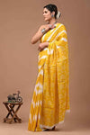 Featuring white abstract wave-like tie-dye stripes across the drape and Bandhani-inspired dotted motifs on the pallu, it strikes the perfect balance between heritage and modern style. Its vibrant bright yellow base instantly uplifts your look, while its soft texture keeps you cool and comfortable all day long.