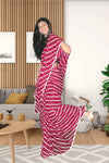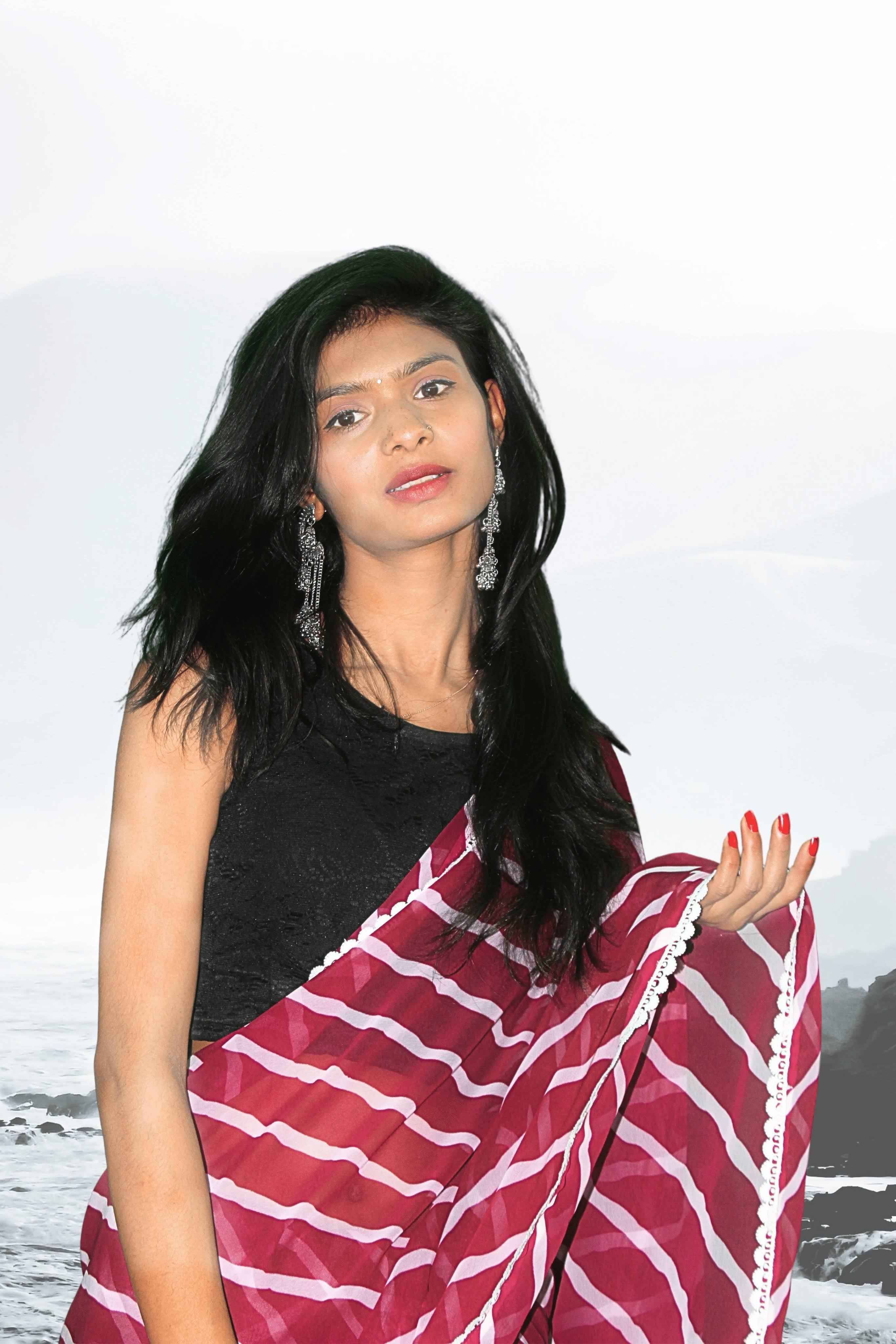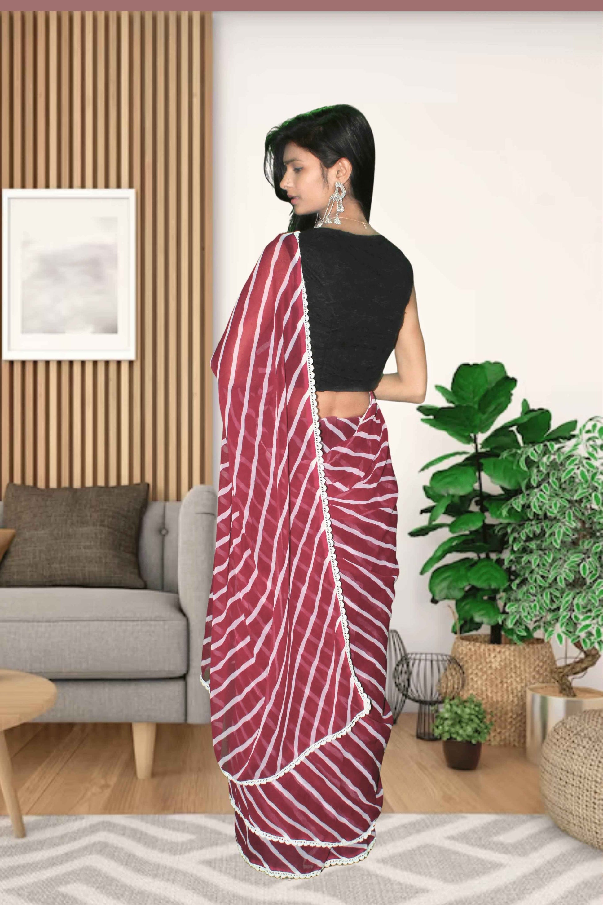 Drape yourself in sheer elegance with Aafreen, a mesmerizing georgette Laheriya saree that captures the essence of heritage craftsmanship with a contemporary twist. Featuring flowing waves of traditional Laheriya print in a striking combination of deep wine and pristine white, this saree celebrates grace, movement, and modern ethnic flair.