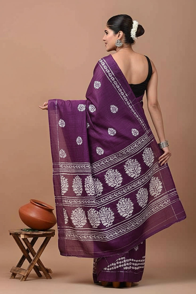 Own the room in bold softness with “Gulaabo Vibe”, a rich purple Mulmul cotton saree brought to you by Yooneck Fashion LLP. Drenched in a vibrant hue of regal violet and adorned with white handblock-style floral and geometric patterns, this saree radiates ethnic elegance with a funky twist.