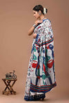 The off-white base is richly decorated with hand-block-style prints in red, blue, green, and white, portraying intricate scenes of rural life, traditional figures, and geometric accents. A bold blue border and pallu enhance its artistic charm, making it a perfect choice for those who cherish textile storytelling and heritage-inspired fashion.